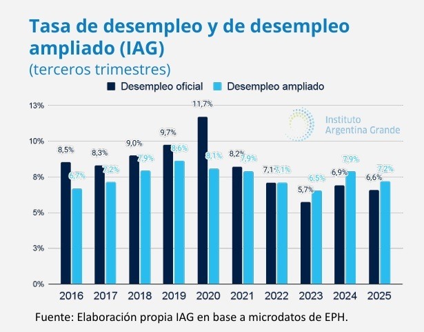 La cifra oficial del Indec sobre el desempleo es del 6,6%. Pero, como en toda estadística, el número depende de las consideraciones que se tomen para medirlo. Si se contabilizara a las personas que buscan trabajar más horas, a quienes han trabajado ninguna o muy pocas horas la última semana (desocupados o subocupados) y a aquellos que trabajaron cierta cantidad de horas pero en una actividad desprotegida y de alta precariedad, el desempleo hoy sería del 13,8%, estima el Instituto Argentina Grande (IAG).