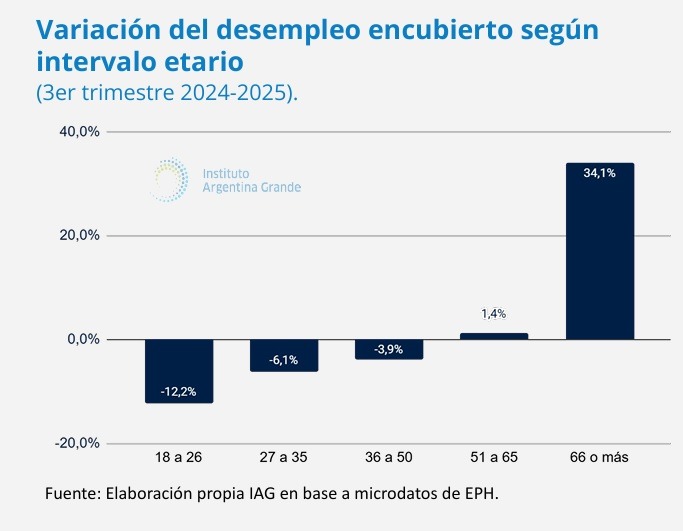 El mismo informe hace una distinción por edades dentro de este universo de desempleo ampliado (o “blue”). El desempleo encubierto (desocupados o empleados que trabajan pocas horas en malas condiciones y buscan trabajo), destacan, “tuvo un crecimiento marcado entre las personas de 66 años o más (+34,1% en un año)”. Contra el tercer trimestre de 2023 la situación es aún más crítica: los jubilados en situación de desempleo encubierto se multiplicaron por 2,5 desde entonces.