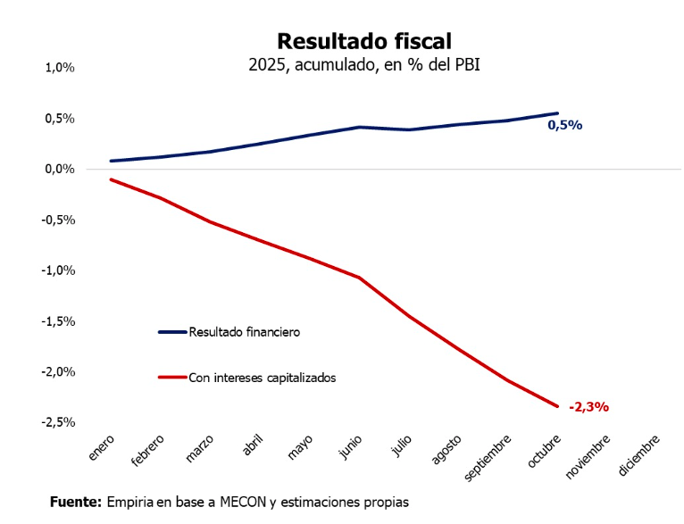 El economista Nicolás Gadano resumió el punto crítico con un cálculo que encendió alarmas dentro y fuera del Gobierno. “Si salimos de la medición caja de las cuentas fiscales, y a los intereses pagados le sumamos los intereses capitalizados que se traducen en más deuda, el resultado financiero acumulado a octubre es un déficit de 2,3% del PIB”, publicó en X. La frase disparó un debate sobre la consistencia del relato fiscal.