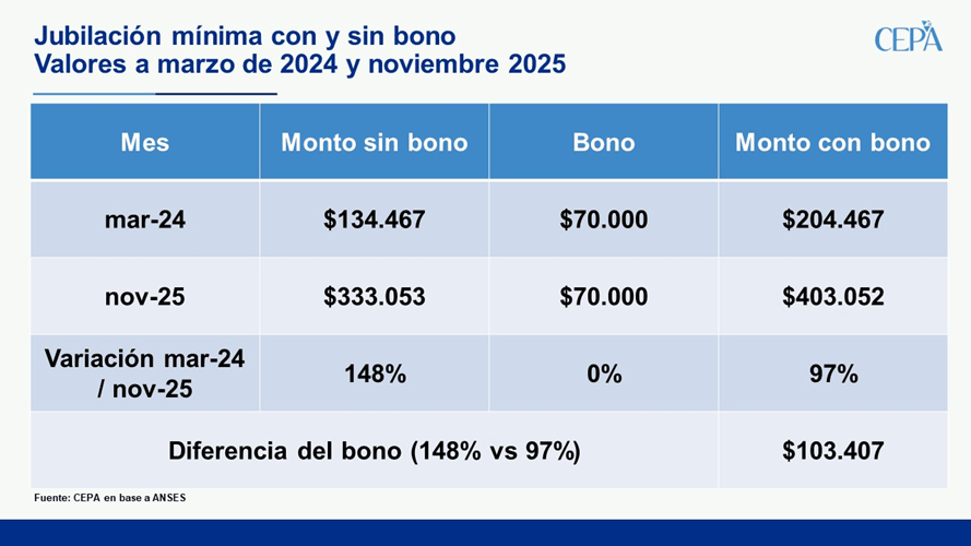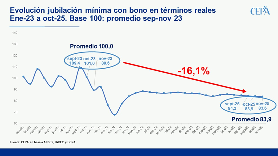 El documento del Cepa advierte que desde marzo de 2024 las jubilaciones subieron 148%, mientras que el bono permaneció sin cambios. “Aunque Milei insista en que las jubilaciones mejoraron, los datos muestran que en el trimestre sep/novi 2025, las jubilaciones con bono —que percibe más del 60% de los jubilados— serán 16,1% inferiores al nivel registrado en el último trimestre del gobierno anterior”, señaló el centro de estudios.