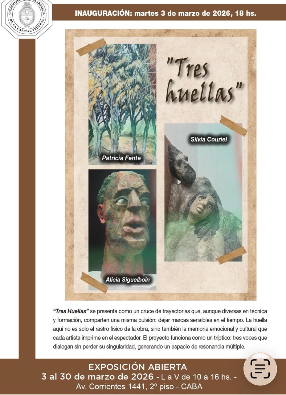 El martes 3 de marzo a las 18 se inaugura la exposición Tres huellas de las artistas visuales Patricia Fente, Silvia Couriel y Alicia Siguelboim en el Colegio Público de Abogados de la Ciudad de Buenos Aires.
