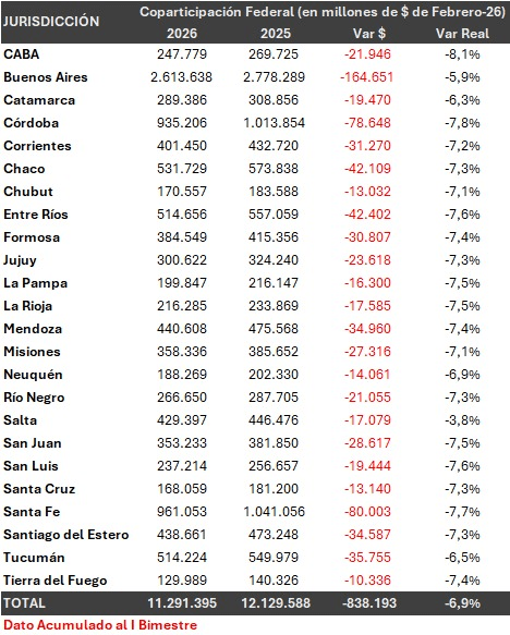 Las cifras oficiales muestran que entre enero y febrero las provincias acumularon una merma real de $838 mil millones en concepto de coparticipación, en comparación con el mismo período del año anterior. El retroceso alcanzó a los 24 distritos, con una caída promedio del 6,9%. Entre los más afectados aparecen la Ciudad de Buenos Aires (-8,1%), Córdoba (-7,8%) y Santa Fe (-7,7%).
