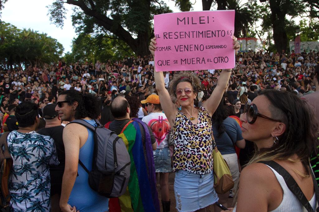 El reclamo se vinculó directamente con el discurso que Milei brindó en Davos 2025, cuando llamó a “extirpar” lo que definió como un supuesto “cáncer”, al referirse a personas LGBT+, feministas, militantes de izquierda y a distintas expresiones de disidencia política e ideológica. Aquellas afirmaciones generaron un amplio repudio social y político y derivaron en una de las movilizaciones más masivas del último tiempo.