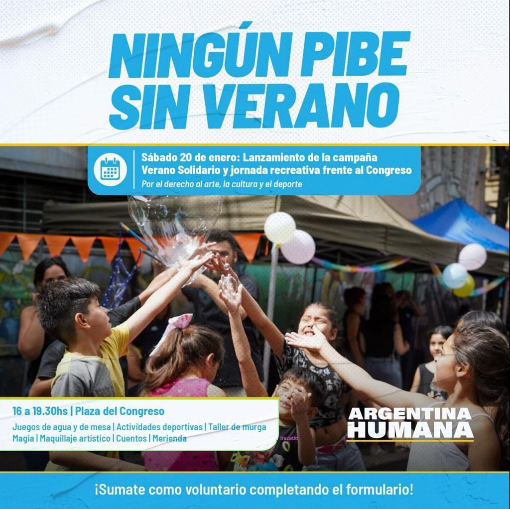El espacio político liderado por Juan Grabois, Argentina Humana, llevará adelante una jornada recreativa para niños, niñas y adolescentes este sábado 20 de enero de 16 a 19hs en la Plaza Congreso (CABA). La iniciativa será la primera de varias que se realizarán a lo largo de enero, febrero y marzo en el mismo lugar bajo la consigna “Verano Solidario”. El objetivo de visibilizar la tarea que realizan organizaciones sociales, sumar voluntarios y defender derechos en riesgo. Se trata de una continuidad de la celebración de Nochebuena junto a personas en situación de calle y el festejo de Reyes que se realizó en Constitución.