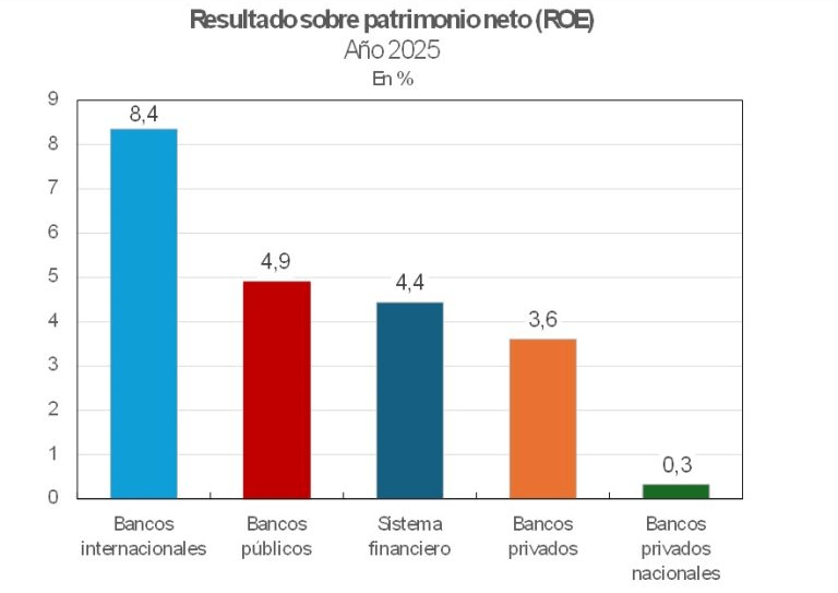 El Banco Central dio a conocer los resultados de las entidades financieras del año pasado. Los internacionales obtuvieron las mejores ganancias del sistema en 2025, con un ROE (Return on Equity) de 8,4%, siendo además el único grupo de entidades que registró un aumento del mismo. Al mismo tiempo, los beneficios de los bancos de capital internacional fueron superiores al promedio de resultado de los últimos dos años.