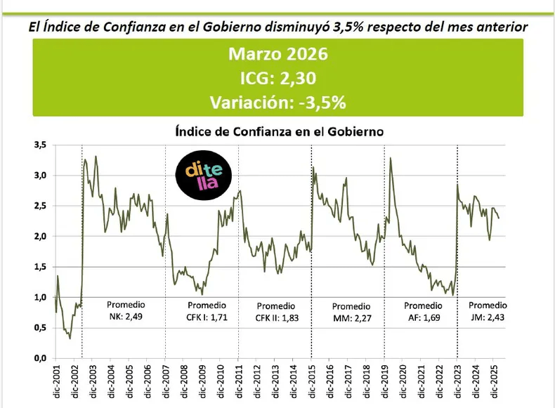 La imagen del gobierno de Javier Milei sigue en retroceso. Según el último informe de la Universidad Torcuato Di Tella, el Índice de Confianza del Gobierno (ICG) cayó 3,5% en marzo y profundizó una tendencia negativa que arrastra desde comienzos de año. En el primer trimestre de 2026, el indicador acumula una baja cercana al 7% y se ubica en apenas 2,3 puntos sobre un máximo posible de 5.
