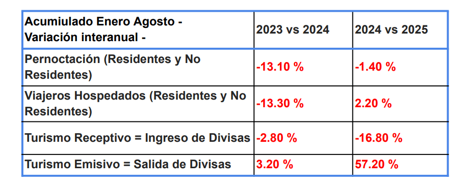 Mientras el turismo emisivo celebra, el receptivo agoniza. Las consecuencias son claras: deterioro de la balanza comercial y pérdida de divisas genuinas. Entre enero y abril de 2024, los egresos de divisas por turismo crecieron 139,6%, mientras los ingresos apenas subieron 26,7%. Proyecciones de Cohen Arazi y la Fundación Encuentro estiman que la salida de dólares por turismo emisivo en 2025 rondará entre u$s 12.000 y 15.000 millones, un récord negativo que agrava el déficit externo.